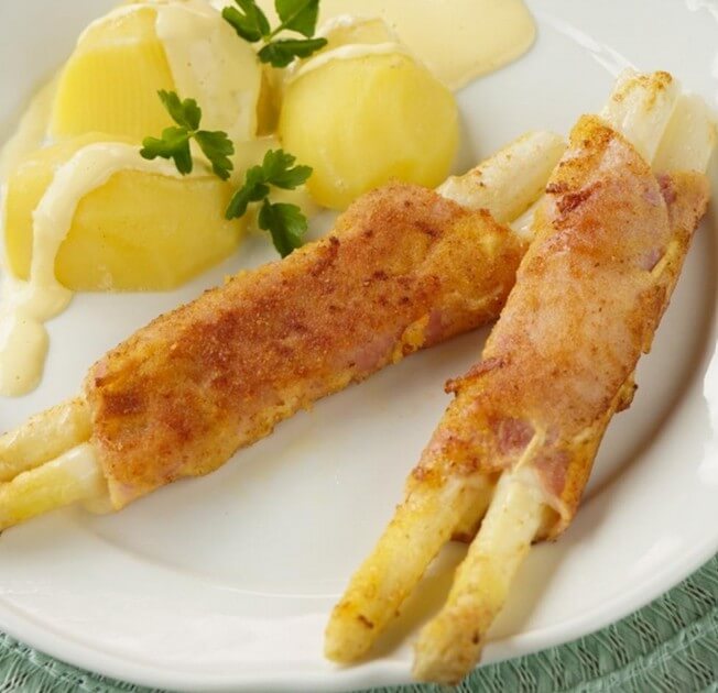 - Belege jeweils eine Scheibe Kochschinken mit einer etwas kleineren Scheibe Käsescheibe. Lege dann 2 Spargelstangen darauf und rolle sie ein. Fixiere sie mit einem Zahnstocher.